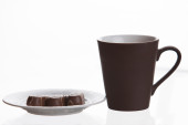 Obraz filiżanki herbaty z kości słoniowej z ciasteczkiem w kształcie serca.