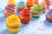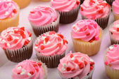 Deser śmietankowy. Babeczki z kremem. Ciastka na różowym tle. Różne słodkie stoły. Słodycze i desery. Wyroby piekarskie