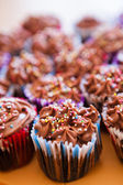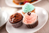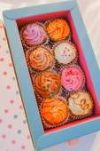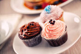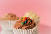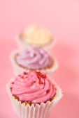 Cream cupcakes.cakes na różowym tle.Cream deser. Słodki stół. Słodycze i desery. Wyroby piekarskie