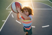Zdjęcie "Aktywny styl życia dzieci. Mały biały sportowe dziecko gra w koszykówkę trzymając piłkę ze szczęśliwą twarzą." może być wykorzystywane do celów osobistych i komercyjnych zgodnie z warunkami zakupionej licencji Royalty-free. Obraz jest dostępny do pobrania w jakości wysokiej rozdzielczości do 5760x3840.