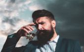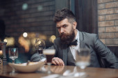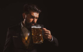 Portret poważnego brodatego hipstera trzyma piwo rzemieślnicze izoalowane na czarno.