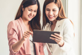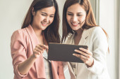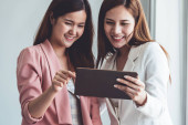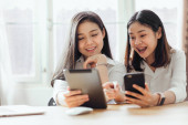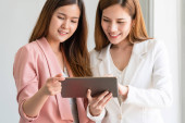 Zdjęcie "Dwie urocze azjatyckie biznesmenki dzielą się swoimi kontaktami w mediach społecznościowych w biurze. Bizneswoman za pomocą smartfona" może być wykorzystywane do celów osobistych i komercyjnych zgodnie z warunkami zakupionej licencji Royalty-free. Obraz jest dostępny do pobrania w jakości wysokiej rozdzielczości do 5760x3840.