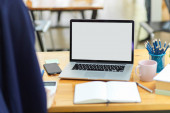 Close-up image, Bizneswoman robi notatki na notatniku z długopisem na drewnianym biurku.
