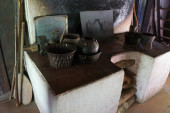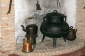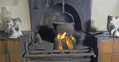 Otwarty ogień używany do palenia trawy i Pete do gotowania w starym irlandzkim domku