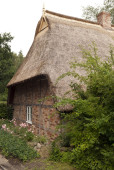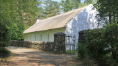 Stary irlandzki tradycyjny kamienny domek z strzechą na farmie w Irlandii