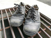 stare skórzane suszenie butów na betonowych kolanach.