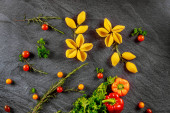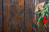 Rozmaryn, czerwona cebula i papryka na rustykalnym drewnianym stole.