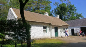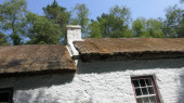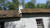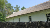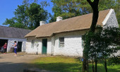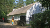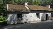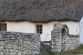 Stary irlandzki tradycyjny bielony domek z strzechą w Ulster America Folk Park w Irlandii Północnej