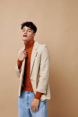 Człowiek czarny jednorazowe szkło w rękach pozowanie moda pojedyncze tło niezmienione