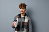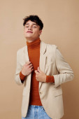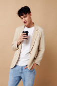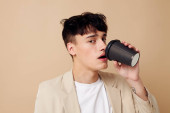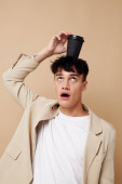 Zdjęcie młody chłopak czarny jednorazowe szkło w rękach pozowanie moda światło tło bez zmian
