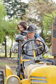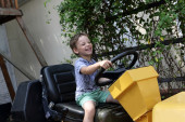 Rudy chłopiec z niebieską koszulką bawiący się w Sperrin Fun and Heritage Farm Co Tyrone N Ireland
