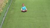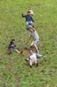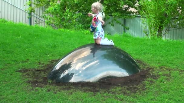 Rudy chłopiec w niebieskiej koszulce bawiący się dobrze na trawiastym zjeżdżalni w Playparku w słoneczny dzień