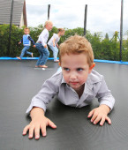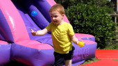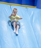 Rudy chłopiec w niebieskiej koszulce bawiący się dobrze na trawiastym zjeżdżalni w Playparku w słoneczny dzień