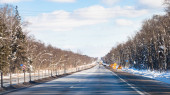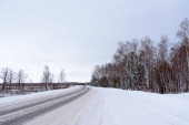 Zdjęcie "Zimowy tor w syberyjskiej tajdze. Lodowata zimowa autostrada biegnie przez śnieg i tajgę. Odcinek autostrady w Chanty-Mansi Autonomiczny Okrug - Yugra między Chanty-Mansiysk i miasta Nyagan" może być wykorzystywane do celów osobistych i komercyjnych zgodnie z warunkami zakupionej licencji Royalty-free. Obraz jest dostępny do pobrania w jakości wysokiej rozdzielczości do 5760x3840.
