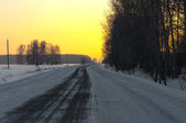 Zimowy tor w syberyjskiej tajdze. Lodowata zimowa autostrada biegnie przez śnieg i tajgę. Odcinek autostrady w Chanty-Mansi Autonomiczny Okrug - Yugra między Chanty-Mansiysk i miasta Nyagan