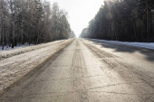 Zimowy tor w syberyjskiej tajdze. Lodowata zimowa autostrada biegnie przez śnieg i tajgę. Odcinek autostrady w Chanty-Mansi Autonomiczny Okrug - Yugra między Chanty-Mansiysk i miasta Nyagan