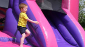 Czerwono-głowe dziecko Rudy chłopiec z niebieskim t-shirtem bawiący się zabawą z zabawkami w Playparku