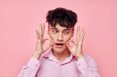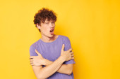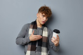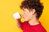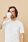 młody kręcone włosy człowiek biały kubek w ręce a napój odizolowany tło bez zmian