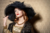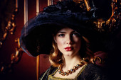 Piękna młoda dama XIX wieku pozująca na ulicy miejskiej. Styl z końca 19 - początku 20 wieku.