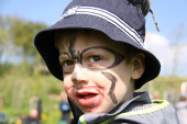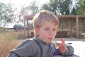 Rudy chłopiec z dziwnym wyglądem z szarym t-shirtem na stole w Playparku w słoneczny dzień