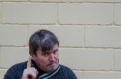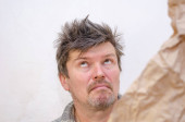 Roztrzepany mężczyzna patrzy w górę za kamerę. Nieogolony mężczyzna z splątanymi włosami we włosach. W środku pokoju. Skupienie selektywne.