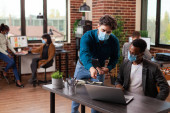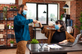 Biznesmeni ubrani w medyczną maskę robiący gest uderzenia pięścią