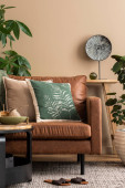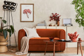 Domowe wnętrze salonu z designerską sofą, makiety ramek plakatowych, wiele roślin, stolik kawowy, ekran pokoju i eleganckie akcesoria osobiste w nowoczesnym wystroju domu. Wzór.