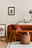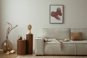 Minimalistyczna koncepcja stylowego wnętrz salonu z aksamitną sofą, makietą ramki plakatu, stolikiem kawowym, poduszką, dekoracją i eleganckimi akcesoriami w nowoczesnym wystroju wnętrz. Wzór.