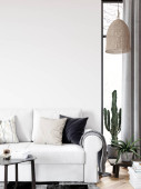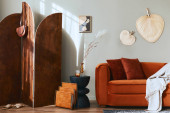 Zdjęcie "Minimalistyczna koncepcja stylowego wnętrz salonu z aksamitną sofą, makietą ramki plakatu, stolikiem kawowym, poduszką, dekoracją i eleganckimi akcesoriami w nowoczesnym wystroju wnętrz. Wzór." może być wykorzystywane do celów osobistych i komercyjnych zgodnie z warunkami zakupionej licencji Royalty-free. Obraz jest dostępny do pobrania w jakości wysokiej rozdzielczości do 5760x3840.