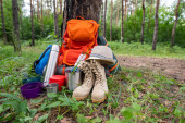 Zdjęcie "Sprzęt dla psów i kempingów w sosnowym lesie. Plecak, termos, śpiwór, kompas, kapelusz i buty." może być wykorzystywane do celów osobistych i komercyjnych zgodnie z warunkami zakupionej licencji Royalty-free. Obraz jest dostępny do pobrania w jakości wysokiej rozdzielczości do 5760x3840.