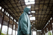 Zdjęcie "Dozymetryczny naukowiec w odzieży ochronnej i masce gazowej sprawdza poziom promieniowania radioaktywnego w strefie zagrożenia. Zanieczyszczenie środowiska, klęska żywiołowa" może być wykorzystywane do celów osobistych i komercyjnych zgodnie z warunkami zakupionej licencji Royalty-free. Obraz jest dostępny do pobrania w jakości wysokiej rozdzielczości do 5760x3840.