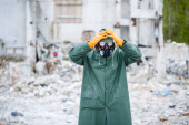 Dozymetryczny naukowiec w odzieży ochronnej i masce gazowej sprawdza poziom promieniowania radioaktywnego w strefie zagrożenia. Zanieczyszczenie środowiska, klęska żywiołowa