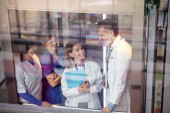 Trzech współczesnych profesjonalnych pracowników medycznych w fartuchach laboratoryjnych dyskutuje