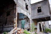 Dozymetryczny naukowiec w odzieży ochronnej i masce gazowej bada strefę zagrożenia. Zbliżenie. kwiat w rękach