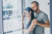 lesbijska para trzymając się za ręce siedząc twarzą w twarz na niewyraźnym pierwszym planie, baner