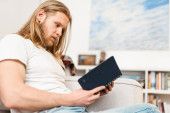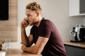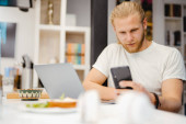 Brodaty blondyn rozmawia przez komórkę podczas pracy z laptopem w domu