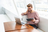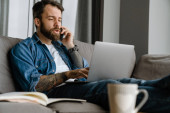 Brodaty blondyn rozmawia przez komórkę podczas pracy z laptopem w domu