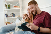 Zdjęcie "Biały mężczyzna i kobieta rozmawiają i śmieją się siedząc na podłodze w domu" może być wykorzystywane do celów osobistych i komercyjnych zgodnie z warunkami zakupionej licencji Royalty-free. Obraz jest dostępny do pobrania w jakości wysokiej rozdzielczości do 5760x3840.