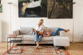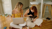 Zdjęcie "Biały mężczyzna i kobieta rozmawiają i uśmiechają się siedząc na podłodze w domu" może być wykorzystywane do celów osobistych i komercyjnych zgodnie z warunkami zakupionej licencji Royalty-free. Obraz jest dostępny do pobrania w jakości wysokiej rozdzielczości do 5760x3840.