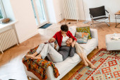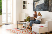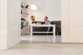 Zdjęcie "Biały mężczyzna i kobieta rozmawiają i śmieją się siedząc na podłodze w domu" może być wykorzystywane do celów osobistych i komercyjnych zgodnie z warunkami zakupionej licencji Royalty-free. Obraz jest dostępny do pobrania w jakości wysokiej rozdzielczości do 5760x3840.