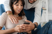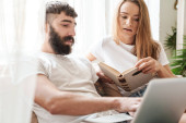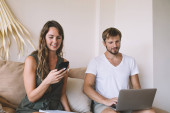 Zdjęcie "Biały mężczyzna i kobieta korzystający z telefonu komórkowego i laptopa podczas siedzenia na podłodze w domu" może być wykorzystywane do celów osobistych i komercyjnych zgodnie z warunkami zakupionej licencji Royalty-free. Obraz jest dostępny do pobrania w jakości wysokiej rozdzielczości do 5760x3840.