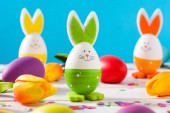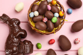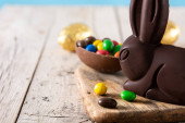 Wielkanocny królik czekoladowy i kolorowe jajka na drewnianym stole