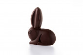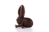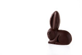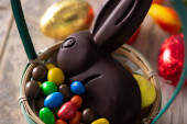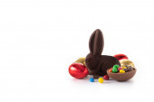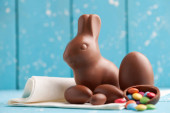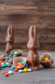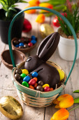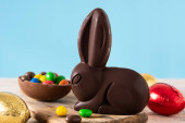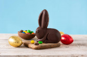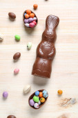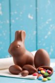 Wielkanocny królik czekoladowy i kolorowe jajka na drewnianym stole