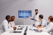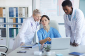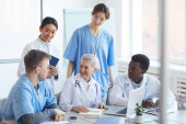 Pewny siebie dojrzały główny lekarz interakcji z pielęgniarką przez miejsce pracy