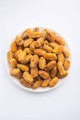 Suszone daty lub sukha khajur lub khajoor serwowane w misce, selektywne skupienie