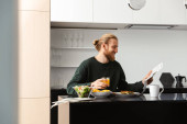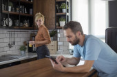 brodaty człowiek za pomocą telefonu komórkowego podczas jego dziewczyna gotowanie w kuchni w domu