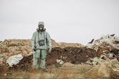 Mężczyzna w masce ochronnej i ubraniu ochronnym bada strefę zagrożenia. Katastrofa ekologiczna. ukierunkowanie selektywne