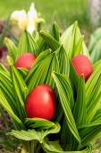 Zdjęcie "Domowe czerwone pisanki w wiosennym ogrodzie" może być wykorzystywane do celów osobistych i komercyjnych zgodnie z warunkami zakupionej licencji Royalty-free. Obraz jest dostępny do pobrania w jakości wysokiej rozdzielczości do 5760x3840.