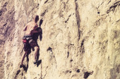 Kobieta wspinająca się na skałę z ogromnym wysiłkiem w pionowej ścianie skalnej