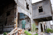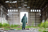 Mężczyzna w masce ochronnej i ubraniu ochronnym bada strefę zagrożenia. Katastrofa ekologiczna. ukierunkowanie selektywne